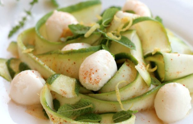 - Полить цукини соусом, добавить шарики моцареллы и цедру половины лимона. Украсить мятой. Перед подачей охладить.